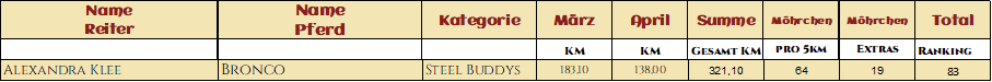 Wie hätte es bei diesem Namen auch anders kommen sollen :) Lara und ihr Buddy sind wirklich etwas ganz besonders und sie verbindet so viel Wertschätzung und Vertrauen! Wir durften ihre Geschichte hören und konnten jeden Monat über ihre Verbundenheit liebäugeln. So ist es auch keine Überraschung das die beiden 585,70km zusammen im Gelände verbrachten und mit geschickt, Witz und Charme auch fleißig ihre Extraaufgaben lösten und somit 199 Möhrchen sammelten! Liebste Lara, bleib so wie Du bist, denn das ist genau richtig und dein Gefühl und Gespür für dein Partner Pferd, ist ansteckend und bezaubernd!