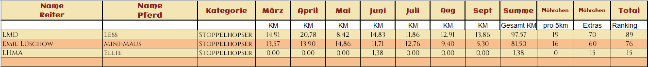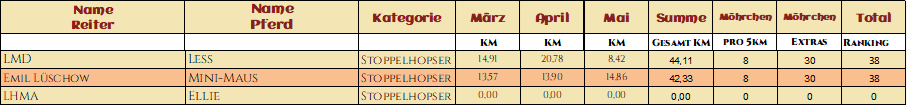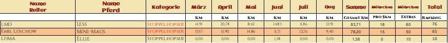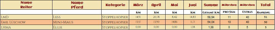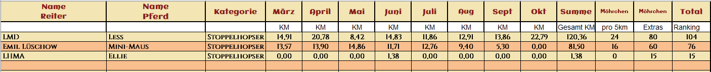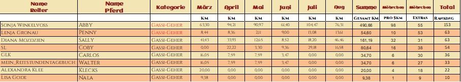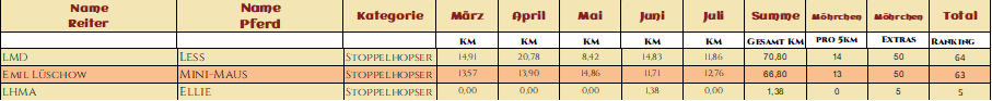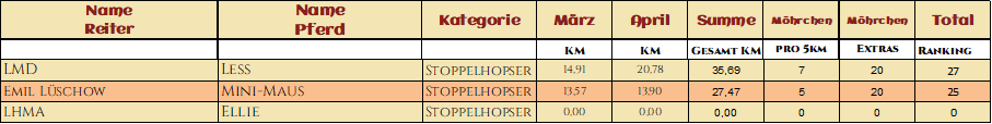 WOW! Was für ein Auftakt im März! So viele tolle Teams haben sich angemeldet! Wahnsinn! Und es wurden so viele tolle Videos, Fotos und Geschichten eingereicht. Wir sind überwältig über so eine tolle Zusammenarbeit. Danke das ihr so viel Spaß dabei habt! In fast jedem Video wurde gelacht, geblödelt oder Outtakes gezeigt, Herrlich, Danke! Das angucken und auswerten der eingereichten Bilder und Videos macht uns so so viel Spaß und ist das schönste für uns an dieser Challenge! Und wir hatten wirklich viel zu schauen und zu staunen! Das Jacken Video hat uns voll Überzeugt, ihr seid alle gut gewappnet! Tolle Pferde, tolle Menschen, ganz großartig! Schöner hätten wir uns den Start mit euch gar nicht vorstellen können! Die Highlights werden noch ein schönes Plätzchen auf der Homepage finden, da seid sicher! Hier nun aber erst mal die Auswertung der ersten Monats und was sollen wir sagen, ihr habt voll gerockt!  Einige kommen jetzt aus ihrem Winterschlaf und werden bald durchstarten und einige haben schon deutlich gezeigt das sie Startklar sind, Mega! Bei einigen deutet sich wahrscheinlich ein kleiner Wechsel der Kategorie, ihrer Motivation entsprechend an, aber da schauen wir mal wie es bei den Paaren weitergeht. Wahnsinn was ihr schon im ersten Monat gezeigt habt! Danke das ihr voll dabei seid! Wir sind echt gespannt wie es weitergeht mit euch! Hier nun endlich eure Ergebnisse!