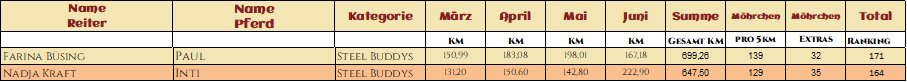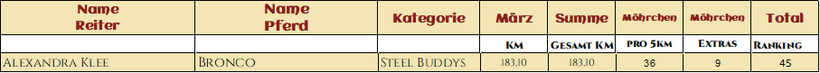 Wie hätte es bei diesem Namen auch anders kommen sollen :) Lara und ihr Buddy sind wirklich etwas ganz besonders und sie verbindet so viel Wertschätzung und Vertrauen! Wir durften ihre Geschichte hören und konnten jeden Monat über ihre Verbundenheit liebäugeln. So ist es auch keine Überraschung das die beiden 585,70km zusammen im Gelände verbrachten und mit geschickt, Witz und Charme auch fleißig ihre Extraaufgaben lösten und somit 199 Möhrchen sammelten! Liebste Lara, bleib so wie Du bist, denn das ist genau richtig und dein Gefühl und Gespür für dein Partner Pferd, ist ansteckend und bezaubernd!